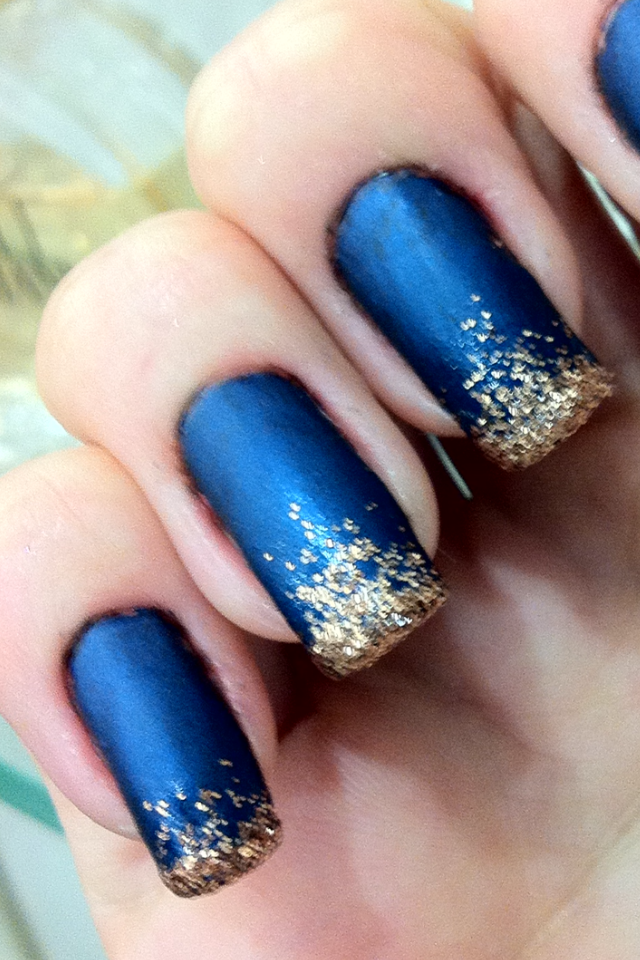 Escolhi a combinação azul escuro + dourado. Apliquei 2 camadas do Miragem Azul da coleção Color Effect (da SPFW! Aliás, onde ombré nails bombaram...) + 1 camada do Aurora Boreal da coleção Be Shine da Elke (queria um tom escuro de azul, mas cromado ao mesmo tempo) e depois apliquei a top coat fosca. Por cima, não tinha esmalte glitter dourado, e o flocado q eu tenho não ficaria bom... Fui criativa: misturei à top coat extra brilho meu glitter para olhos dourado da NYX e... Deu certo! Misturinha na esponja, batidinhas na unha, e depois de novo, só na pontinha; pronto!